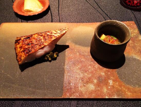 2. 备长炭烤物,今日呈上的是炭烤喉黑鱼和牛油果拌菜。