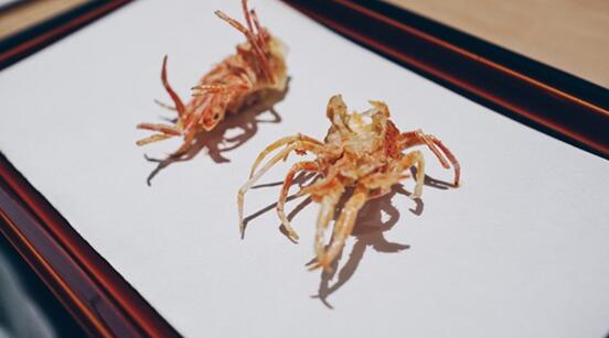 海胆软嫩,经不起长时间油炸,厨师的动作必须十分小心。在厨师的悉心料理下,油炸紫苏叶的清香和海胆的甘甜结合在一起,美味异常。