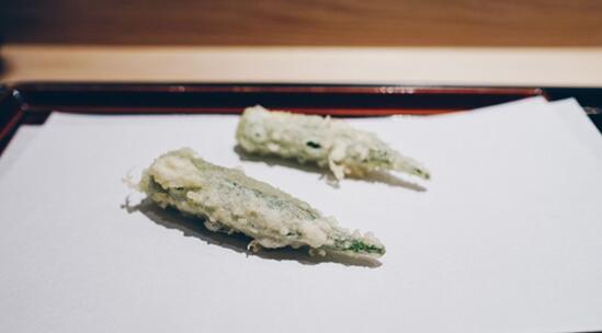 近藤所用的是4厘米左右的秋葵,由于市面上小秋葵并不多,他联系农家为他专供。料理时,为了体现秋葵特有的粘腻感,近藤会炸的比较浅,并烘托出秋葵的香气。
