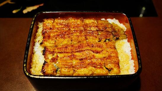 鳗鱼料理,一般分为“关东流”和“关西流”两派,杀法烤法各有不同,但最后的酱烤程序,关东和关西都是做成“蒲烧”鳗鱼。“蒲烧”鳗鱼习惯的吃法是做成盖饭,盖饭放在碗里的称作“鳗丼”,放在贵重漆器盒里的称作“鳗重”。