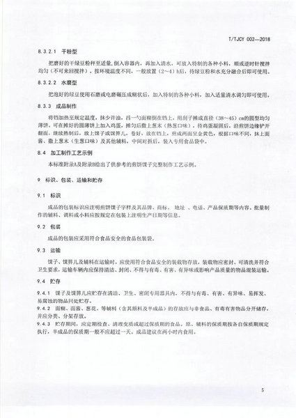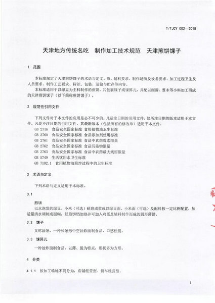 该团体标准规定了天津煎饼馃子的术语与定义、原、辅料要求、制作场所及设备要求、加工过程卫生及人员要求、制作工艺要求、标识、包装、运输与储存等内容。并称该标准适用于以绿豆为主料制作的煎饼,其包裹馃子或馃箅子,并配以面酱、葱末等小料加工而成的天津煎饼馃子。