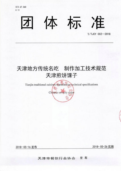 煎饼馃子制作也有标准了,5月25日,天津市餐饮行业协会发布《天津地方传统名吃 制作加工技术规范 天津煎饼馃子》团体标准。该团体标准详细规定了天津煎饼馃子的定义、原料、制作工艺要求、标识、包装等内容,其中包括煎饼馃子薄饼直径应在(38~45)cm范围内,半成品保质期一般不超过一天。
