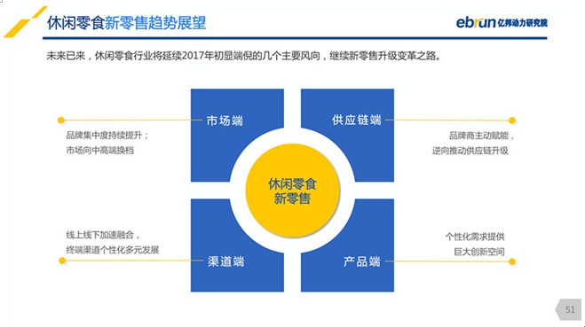 根据”报告“,在新零售语境下,“休闲零食”是围绕消费者多维、高阶需求衍生的多品类、富场景、强创意的食品大集合。同时,面对整个休闲食品万亿增长空间, 以三大巨头引领的休闲零食行业呈现出产品健康化、渠道多元化、服务场景化、运作精细化等特征。