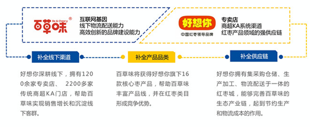 根据百草味在战略融合中的披露信息,好想你的产业优势包括线下渠道,从原料产业园到线下销售,都有完整的产业链,同时,核心产品红枣也是百草味核心的供应来源,另外就是好想你多年运营积累的线下KA渠道等。