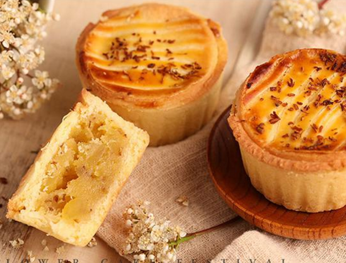 而林仟祥大师则向我们透露,桂花栗子酥的创意灵感来自于蛋挞,用挞类产品的制作方式,将香甜绵密的栗子包裹在内,再使用一层挞皮覆盖,最后撒上桂花。