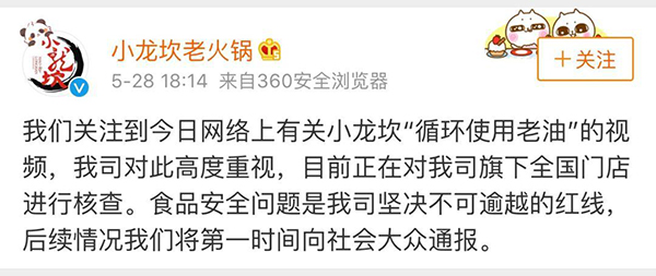 问题被曝光后,28日下午,小龙坎在其官方微博上回应称,他们已关注到网络上有关小龙坎“循环使用老油”的视频,“我司对此高度重视,目前正在对我司旗下全国门店进行核查。食品安全问题是我司坚决不可逾越的红线,后续情况我们将第一时间向社会大众通报”。