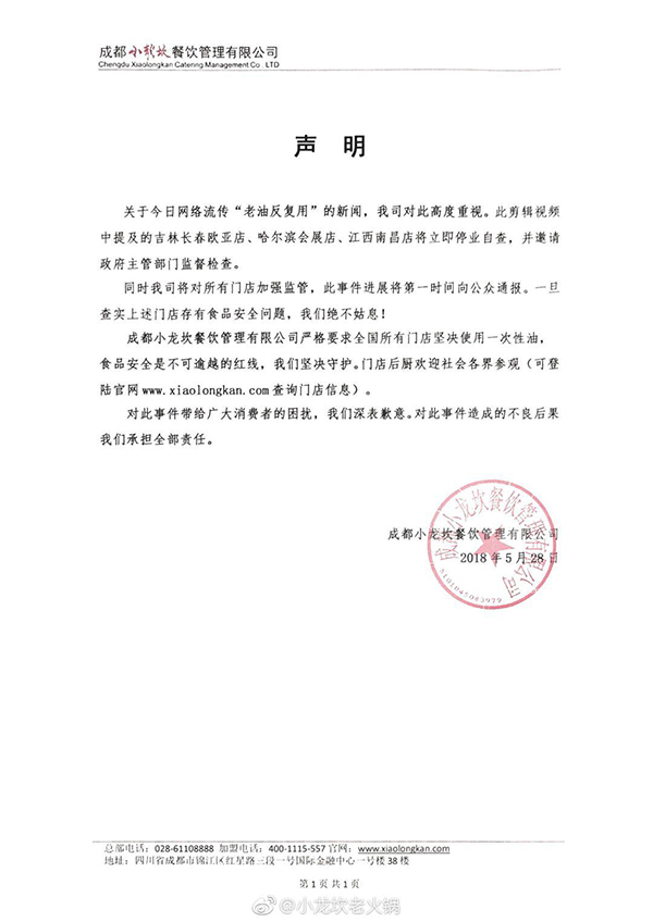 昨日晚间,小龙坎又发布消息,称视频中提及的吉林长春欧亚店、哈尔滨会展店、江西南昌店将立即停业自查,并邀请政府主管部门监督检查。“成都小龙坎餐饮管理有限公司严格要求全国所有门店坚决使用一次性油,食品安全是不可逾越的红线……对此事件带给广大消费者的困扰,我们深表歉意。对此事件造成的不良后果我们承担全部责任。”