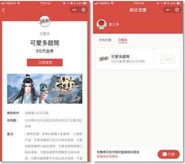 优惠券与销售渠道直接绑定,加上基于LBS的门店推荐,能够实现领券——核销一站触达。在领取优惠券后,原价4元的可爱多只要1元。一连串毫无间隙的“种草”加指引,极大提升了消费群体前往店铺消费的行动力。最后,随着消费者以微信支付核销优惠券,完成整个转化链条。
