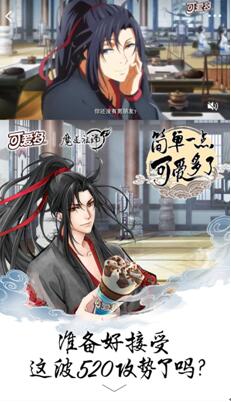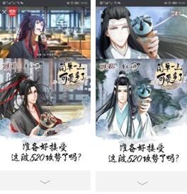 在广告内页中,“魏无羡”和“蓝忘机”两大《魔道祖师》男神专属视频,分别“代言”两种表白方式,让用户人群在动画上映前提前收到男神们的表白宣言。大IP与“520”的绑定,更好的搭建了目标消费者对品牌价值的好感和认同。