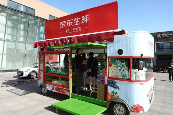 现场还有一辆京东生鲜小车,满载时鲜水果引得与会嘉宾流连忘返。果肉饱满、汁水丰沛的各种新鲜水果当场被下单。