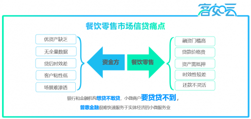 彭雷表示,信息化正推动餐饮行业全面进入门店智能化时代,但目前来看,餐饮行业却仍然面临“三高一低”——房租成本高、人力成本高、食材成本高、利润低这一系列难题。尤其在资金方面,面对餐饮企业的贷款需求,银行和金融机构想贷不敢贷,小微商户要贷贷不到,普惠金融很难快速服务小微企业。而客如云通过将收集的门店数据可资产化,能够直接促成3~100+万信用贷款。