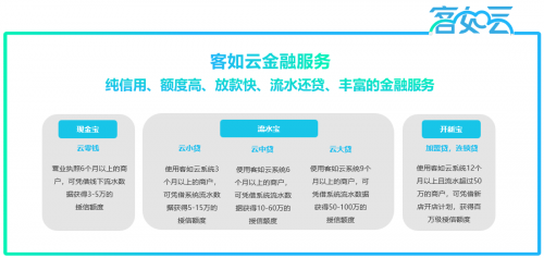 客如云依托海量数据库建立了专业精准的风控模型,从而可以降低金融坏账率。回顾客如云金融服务,信贷不良率仅为0.78%,而一般银行信贷不良率达1.5%,互联网金融信贷不良率高达5%。目前,客如云已经推出了多项面对不同商户的专属定制化信贷、分期、租赁金融服务:云小贷、云中贷、云商贷、读秒钱包、极速借、客易租······可直接覆盖餐饮门店全生命周期的资金需求。