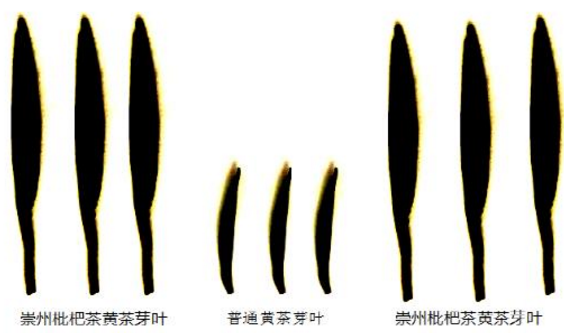 制茶大师这一句生气的话,表明了“我”与其它茶树不一样,这更加激荡人们的好奇心。有人把“我”的芽叶送到一家为名茶做代工的茶加工厂要求制茶。工厂大师问:叶子这么长,是不是茶树芽叶啊?听到解释后,这位大师退却了,不敢做“我”这个茶,怕做坏了无法赔偿损失。这时,一位30多岁的年轻制茶大师站出来,看了看芽叶说:“我来做,我试试给你制成红茶,黄茶,应该是好茶,上等好茶!”就这样,年轻人打破常规工艺,他把“我”制成红茶和黄茶。制成茶叶后,茶叶很长,让人奇异不止(见下图:崇州枇杷茶黄茶与普通黄茶的比较)。此茶泡汤,微黄、清透、醇香,品者喝后,人人叫好。