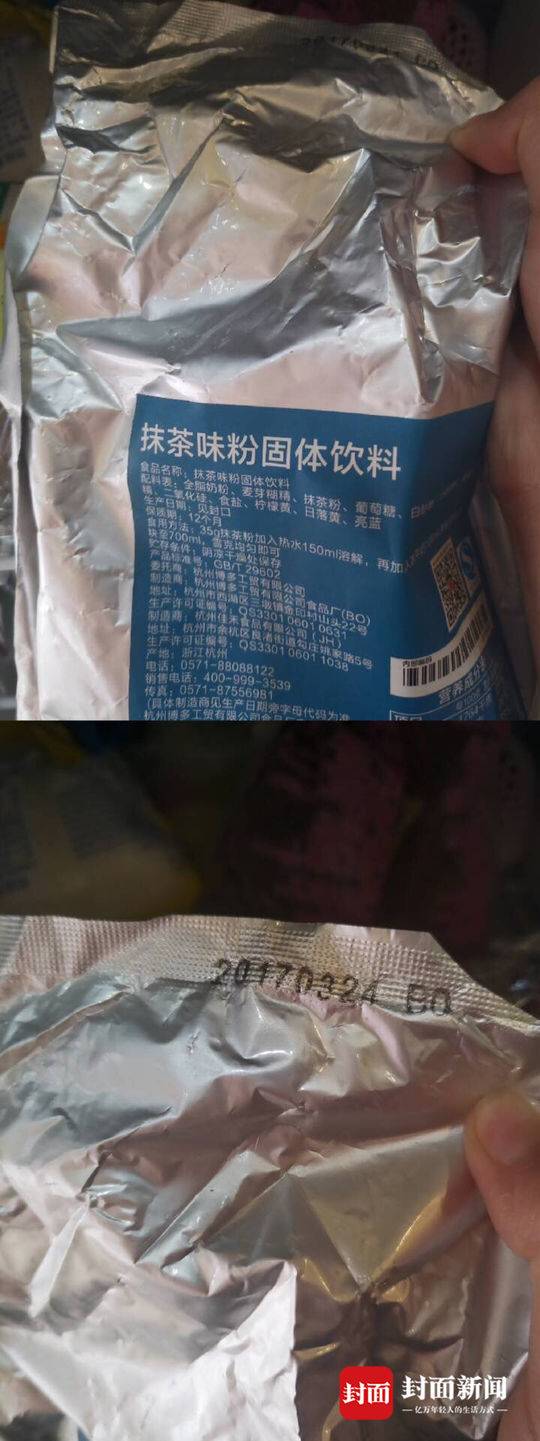 随后,封面新闻记者在该网友公开的几张照片上看到,一个名为“抹茶味粉固体饮料”的银色包装上明确标有保质期12个月,而该原料包的生产日期写着20170324;另一个名为“芋全粉风味固体饮料”的包装上同样写着保质期12个月,生产日期则印着20160702;还有一张黄色包装的西米照片,包装袋顶部有一处椭圆形破损。该网友配文称:“被老鼠咬了的西米,今天只有一包了,用了一包了。”
