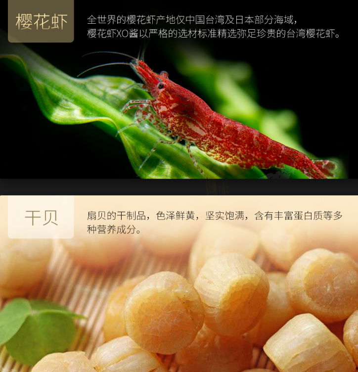 锋味李锦记樱花虾 XO 酱由谢霆锋先生伙拍米芝莲二星名厨谭国锋师傅设计,选用樱花虾、干虾、上等干贝等材料精制而成,配以辣椒,带出辣味温和的味道,食法千变万化。樱花虾 XO 酱既可作为餐前或伴酒小食之佳品,亦适合伴食各款佳肴、中式点心、粉面、粥品及日本寿司,更可用于烹调肉类、蔬菜、海鲜、豆腐、炒饭等。李锦记首次于酱料加入樱花虾,风味独特,尊贵非凡!