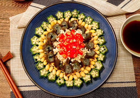 准备原料:宫品级水发海参、秋葵、黄豆、小米椒、蒜、八角花椒水、酱油、白糖、香油、麻油、盐。做法:1.准备好食材,八角花椒水是提前一天放在冰箱里浸泡好的,煮黄豆用。2.秋葵焯水一分钟即可,捞出冲凉。3.锅中添入泡好的花椒八角水,放姜片葱段,将黄豆煮开(黄豆提前6小时用温水泡至肿胖),捞出晾凉。4.将秋葵切小段摆盘,黄豆晾凉摆盘,海参切段摆盘。放上蒜末和小米椒碎,加适量盐、酱油、白糖、香油和麻油搅拌均匀,淋上即可。