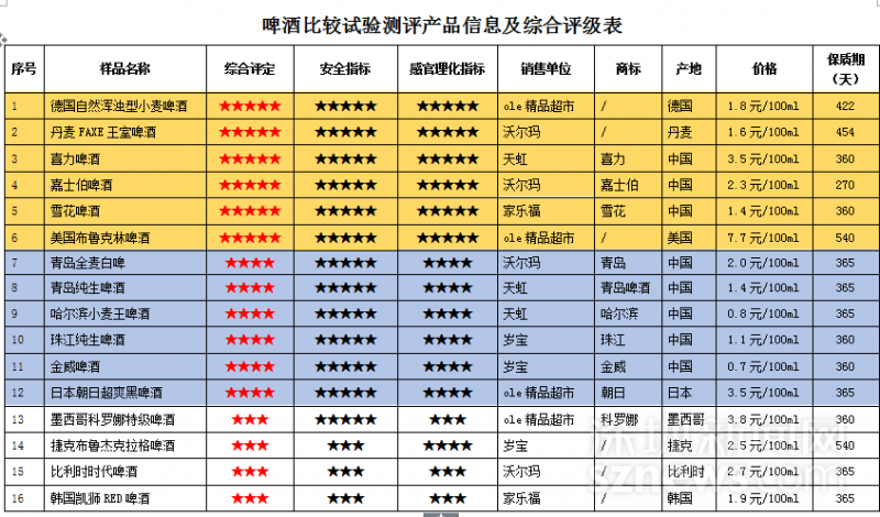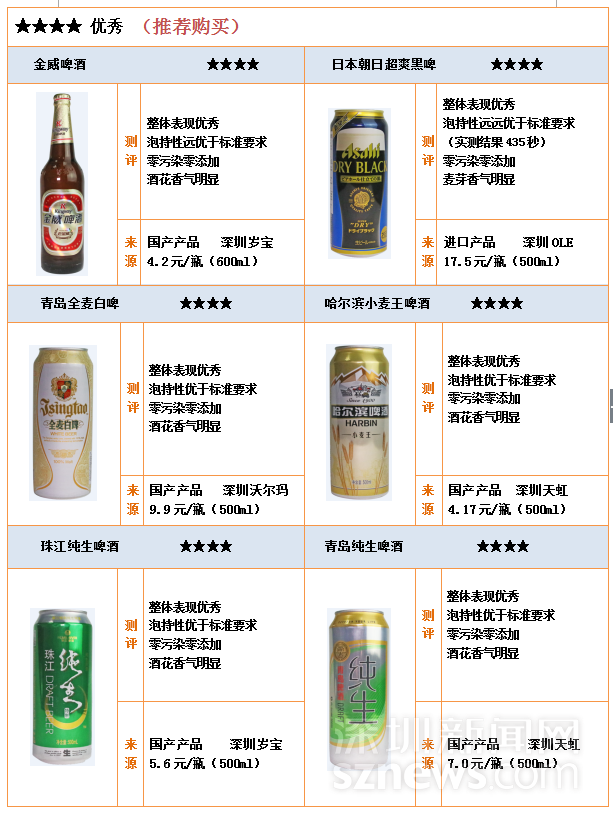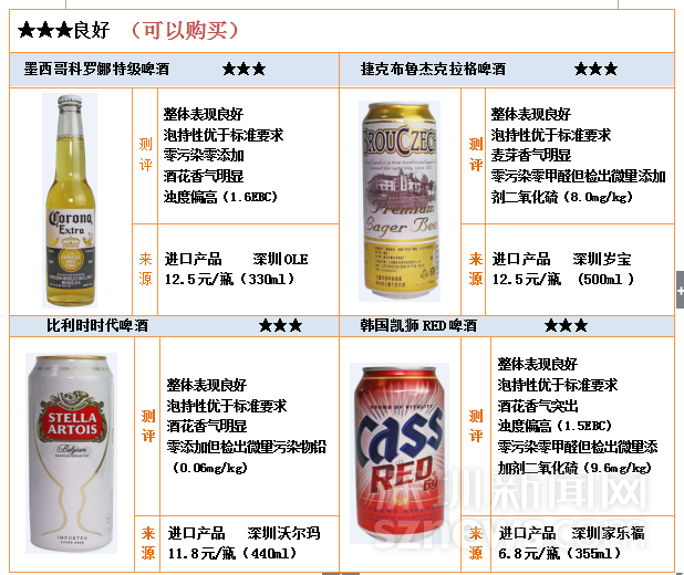16款中外啤酒中,6款评级五星,国产与进口各3款,分别为:德国自然浑浊型小麦啤酒 、喜力啤酒 、丹麦FAXE王室啤酒 、嘉士伯啤酒、 雪花啤酒、美国布鲁克林啤酒。获得四星评级的有6款,国产5款进口1款,4款三星评级均为进口啤酒。另外,16款中外啤酒均未出现违规使用添加剂和污染物超标情况,均符合国家食品安全标准,甲醛含量均优于国标要求。
