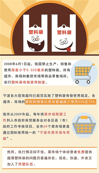 相比之下,各大菜市场、早餐小店等在“限塑令”的执行上成了“硬骨头”。事实上,宁波从2009年起,每年将菜市场限塑工作列入市政府商贸服务业对各区县(市)政府工作考核项目,全市69个菜市场更是通过招标使用统一的“宁波市菜市场专用袋”,各级政府部门在流通环节和生产环节持续进行把关和监管。然而,菜市场和各类餐饮小店的执行情况却不佳,特别是菜市场个体经营者免费提供超薄塑料袋的问题仍普遍存在。有个体商户坦言,这是无奈之举,“如果提出收费,顾客扭头就走,生意没法做。”在一些小型市场、超市、杂食店,“禁塑令”的执行因塑料制品成本、质量问题等,确实存在打折扣现象。“十多斤超薄塑料袋只要七八十元,相比菜市场3元至15元100个的环保专用袋,肯定要选超薄塑料袋了!”走访中有不少菜市场摊主说。