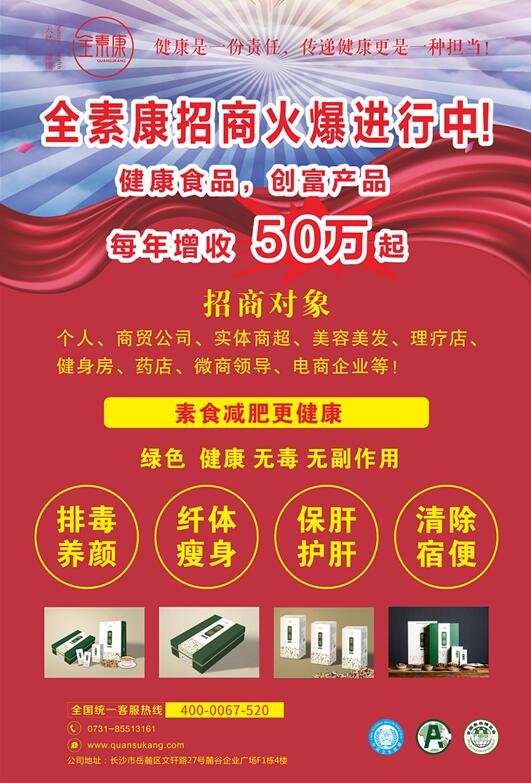 湖南全素康生物科技有限公司是一家集科研、生产和销售于一体的生物科技企业,专注于五谷杂粮类的健康食品的研发、生产和销售。目前,全素康开启全面招商,想要从事大健康产业的有识之士,可以全身心投入,加入到健康产业的行业中来。