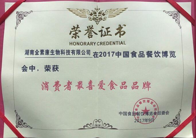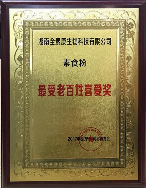 目前,旗下全素康素食营养代餐粉,自产品推出以来,就不断受到消费者喜爱,并在多次国内大型食博会获得荣誉奖项。在2017年9月中国食品餐饮博览会,全素康荣获“消费者最喜爱食品品牌”。在2017年11月中国宁波食品博览会,全素康荣获“最受老百姓喜欢奖”。
