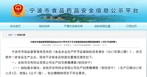 据通告,宁波市市场监督管理局发布的《食品安全生产环节监督抽检信息通告(2017年第12期)》显示,余姚市百利饼业有限公司生产的蔗糖薄脆(韧性饼干)(生产日期2017年11月1日、规格4.5公斤/箱),检出糖精钠项目不符合要求。经自查,系原料把关不严,原料带入糖精钠所致。