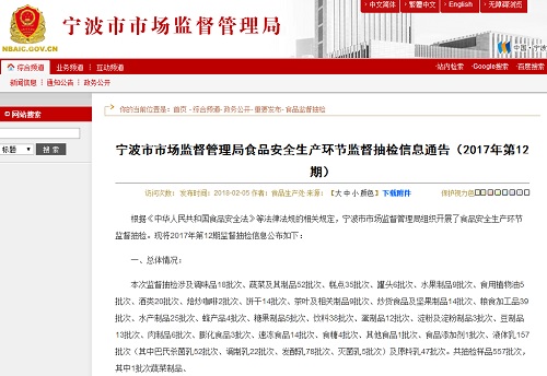 宁波市市场监督管理局食品安全生产环节监督抽检信息通告(2017年第12期)