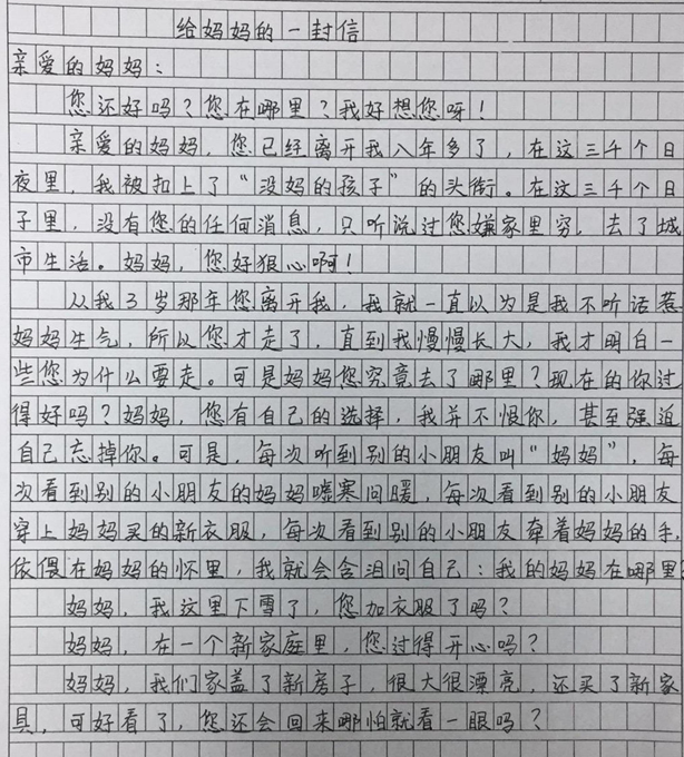 来信的孩子,全部都是“六个核桃·读书慧”公益项目捐赠过的山区孩子,他们大多数人的父母都在外打工,长久缺失的陪伴让孩子们充满了对亲情的渴望,许多孩子都通过书信的方式表达着内心的思念。其中,就有这样一封来自河南省的小朋友写来的信件,而一直存在于他的书信里的,是对母亲的渴望。