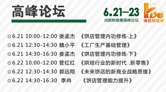 2018年第十三届成都烘焙展急你所急,想你所想。6月21-23日成都世纪城新国际会展中心,主题烘焙论坛专为烘焙从业者量身打造,烘焙行业问题全解读,提前预约就可获取现场免费席位。在第十三届成都烘焙展的现场,来自烘焙先锋的行业金牌导师郭远翔、管红红在现场针对饼店发展,业绩提升为您解答。更有来自博尊烘焙的行业大咖导师娄孟杰老师、驻店指导老师季冉老师、生产管理老师魏小平老师都会齐聚,在现场可以就公司发展、门店管理、生产管理等各方面为您一站式解答。