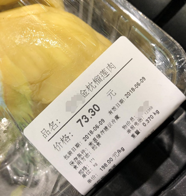 某超市中金枕头鲜榴莲售价