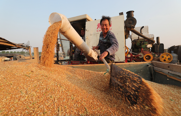 2018年6月12日,在江苏连云港市赣榆区宋庄镇宋庄村的麦田里,农民驾驶收割机收获小麦。