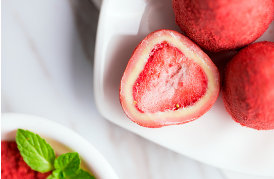 熊孩子草莓夹心巧克力于520情人节前夕横空出世,兼具颜值、创意和美味让其成为情侣之间互送礼品的不二之选。与以往夹心巧克力不同的是,熊孩子草莓夹心巧克力中间的夹心不是巧克力或是榛子,而是一整颗的冻干草莓,在保留草莓原味的同时赋予巧克力新口感,兼顾健康和美味,突破形式与口感,其独特的冻干技术工艺使得新鲜草莓原有的色香味及营养成分较大程度地保留了下来,而且通过蒸发水分保留整颗草莓的完整结构及形状,赋予新的口感。