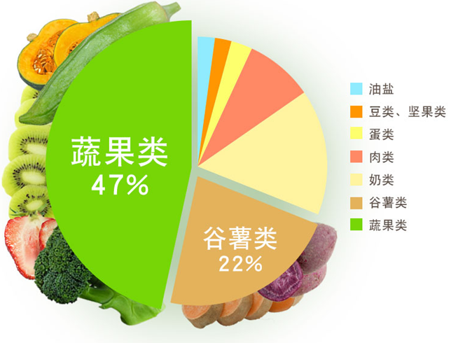 不仅如此,47%的蔬菜和22%的谷薯组合比例,是按照中国营养学会《中国居民平衡膳食宝塔(2016)》的关于“中国人每日饮食比例”研究数据搭配而成的。