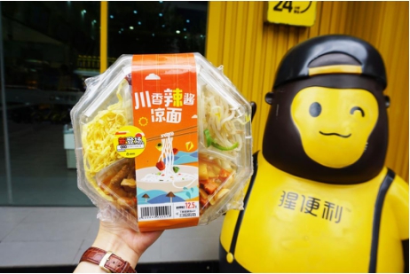 为了保证用户吃到最新鲜的凉面,猩便利有着一套严格的商品管理流程。在自有的鲜食生产基地制作完成后,凉面会被直接送入冷藏间,运输到门店的全程采用了智能冷链物流。在门店内,鲜食存放区采用了进口冷柜,并严格遵守商品上架和下架的标准,充分保障了凉面的品质和口感。