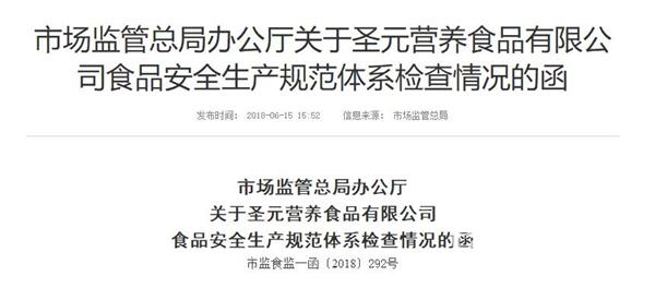 6月15日,国家市场监督管理总局在官网上发布函件,就2018年3月在圣元营养食品有限公司(以下简称“圣元公司”)检查中发现的问题进行了通报,要求圣元公司尽快整改,并在整改后向山东省食品药品监督管理局提出验收申请。信网(热线0532-80889431)致电圣元公司,工作人员回应称这只是一次例行检查,检查中发现的缺陷与产品质量问题无关,公司能够保证目前市面上在售的产品不存在质量问题。