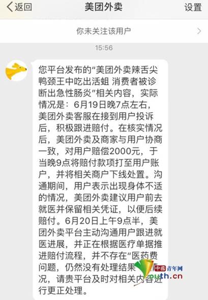 20日晚,美团外卖对爆料该信息的微博博主回应称,实际情况是6月19日晚7点左右,美团外卖客服在接到用户投诉后,积极跟进赔付。在核实情况后,美团外卖及商家与用户协商一致,对用户赔偿2000元,于当晚9点将赔付款项打至用户账户,并将相关商户下线处置。沟通期间,用户表示出现身体不适的情况,美团外卖建议用户前去就医并保留相关凭证,以便后续赔付。6月20日上午9点半,美团外卖平台主动沟通用户跟进就医进展,并正在根据医疗单据推进赔付流程,并不存在“医疗费问题,仍然没有处理结果”的情况。