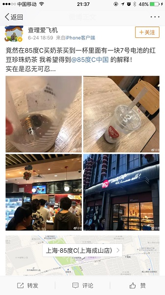 随后,记者与85℃津味实业(上海)有限公司取得联系。公关负责人王小姐表示,在接到消费者投诉后,第一时间调阅了店员做饮品过程的监控,并未发现有任何操作违规行为。“店员都是严格按照标准流程执行,电池基本不可能会出现在操作台。”王小姐表示,珍珠和红豆都是需要现煮的“用大锅煮原料,根本用不到电池,电池也不可能混入。”另外,她还强调,消费者是透过外卖平台订的奶茶,并不是第一时间在店里发现有电池存在,中间存在太多变数。“本着让消费者满意的态度,店家才会提出以一赔十的补偿。对张小姐的遭遇,我们也深感抱歉。”