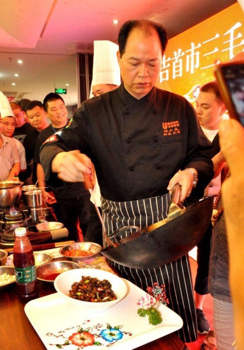 湘菜大师张小春现场烹制血浆五花肉和发丝脆骨。