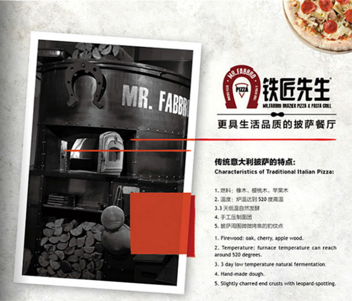 其次,披萨的通常做法是用发酵的圆面饼上面覆盖番茄酱,奶酪和其他配料,并由烤炉烤制而成。铁匠先生则不同于别的披萨的做法,纯手工制作为特点,且酱汁就足以秒杀食客味蕾。酱汁是从意大利精选出来的整粒装去皮罐头,加入熬制六小时以上的牛骨高汤、意大利香料、特里克特雪花盐调味,最后用文火熬制四小时,最后才淋在芝士上层。值得一提的是铁匠披萨是在520度高温明火的烤炉里经过1分30秒烤制而成,这样的披萨成品不光使馅料和芝士香甜的味道完美的结合在一起,同时也使食材中的营养完全激发出来,美味不可抵挡。