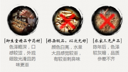 好药材一直都是成都御生堂的精髓,成都御生堂与成都中医药大学退休专家团达成医药技术合作关系,由专家团代表邓世发老先生亲自监督,邓老先生在中药材的采购上有着严格标准,成都御生堂所采购的每一味药都要求从原产地购买;因为同一味药,产地不同,工艺、药效则差之千里,以淮山为例,其原产地在河南焦作,虽然广东也产淮山,但药效相距甚远。