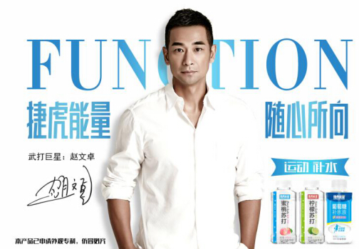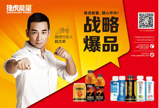 为了树立品牌形象、提高品牌知名度、增强品牌记忆度等,广东椰公司斥资重金签约影视功夫巨星“赵文卓”,作为捷虎能量功能饮料系列的品牌形象代言人。据悉,此次广东椰泰选择赵文卓作为捷虎能量功能饮料系列品牌代言人,是看中赵文卓健壮的武打形象,本直善良的人格特征,无与伦比的男性魅力,与捷虎能量理念极为契合。此次,赵文卓为捷虎能量品牌倾情代言,引起了行业内一系列的轰动,不仅提升了捷虎能量品牌形象及知名度,增强品牌记忆,更进一步打造捷虎能量功能饮料系列在功能饮料市场中销售热潮。