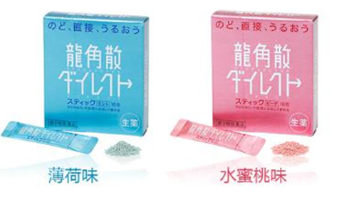 200年前诞生的“龙角散”,随着时代的进步,2008年研制开发了龙角散清喉直爽颗粒,也是日本第三类药品(根据国家不同分类有所区别),包括蓝色的薄荷味和粉色的桃子味。