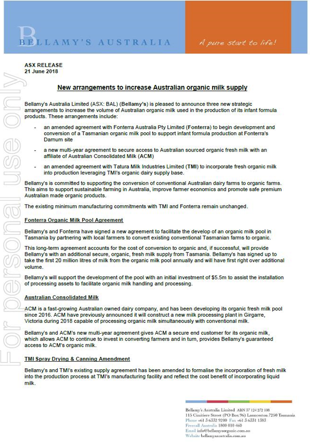 贝拉米澳大利亚有限公司于2018年6月21日正式宣布了关于澳大利亚有机奶业的三项新的战略协议,旨在支持澳大利亚当地有机奶业的可持续发展。而此三项战略协议的签署,也为贝拉米澳大利亚有限公司可用于生产婴儿配方奶粉的有机鲜奶供给量带来了显著增长。