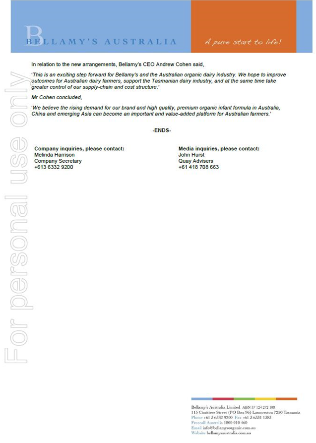 贝拉米始终坚持扶助澳大利亚传统农场向有机农场进行转换,旨在支持澳大利亚可持续农业的发展,改善牧民经济状况,并推广澳大利亚原产、安全、优质的有机产品。此次,贝拉米与恒天然澳大利亚有限公司(恒天然公司)签署一项修订协议,旨在启动塔斯马尼亚州有机奶源池的改进和转换,来支持恒天然公司达润工厂的婴儿配方奶粉生产;为确保贝拉米公司获得澳大利亚有机鲜奶的供应,贝拉米与澳洲联合乳业(ACM)子公司签署一项新的多年期协议;同时与塔图拉乳业有限公司(塔图拉)签署一项修订协议,旨在将有机鲜奶纳入生产,从而更好利用塔图拉有机乳制品供应基地。