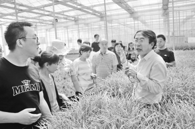 图为与会同志在北京市农林科学院蔬菜研究中心通州于家务基地,参观考察无土栽培技术,该中心研究员刘明池在介绍“水培韭菜”生产情况。