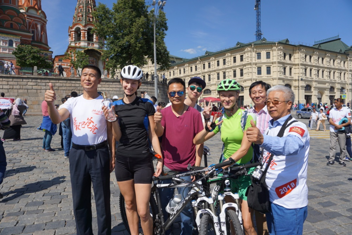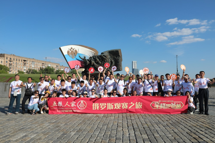 (五粮人家“举杯吧爸爸”俄罗斯观赛团于莫斯科胜利广场前合影)