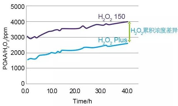 OA Plus中双氧水浓度较低,可以显著延长排放时间。生产线现场追踪双氧水累积浓度趋势,连续2个产程,配制罐无需进行排放和排空,双氧水浓度<5000ppm。