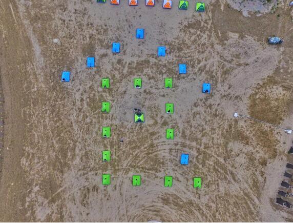 航拍夜宿沙漠,帐篷组成“仓”字队形