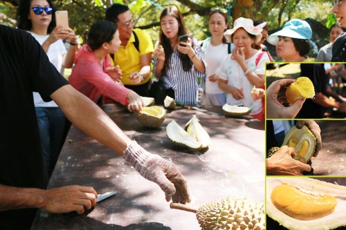 不一会儿,产业园的管理人员便热情的邀请大家来到一棵老树下,现场开猫山王榴莲供大家伙品尝。所有的猫山王榴莲全是当天早上的掉果,新鲜无比。金黄色的果肉,散发着诱人的香味。此时,客户们早已激动无比,刚一开果,立马分而食之,再开果,又是立马被瓜分。马斯诺的董事长笑着说道:大家敞开吃,我们自己产业园的果,管够。在一片欢乐声中,几十个猫山王榴莲鲜果转眼间被消化干净,客户们吃的极为开心,对猫山王更是赞不绝口,意犹未尽。