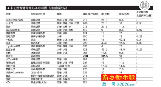 检测结果显示,全部样品均检出咖啡因,含量范围为125-728m g/kg,最高的是米芝莲的香港鸳鸯奶茶,高达728m g/kg.工程师表示,这可能与鸳鸯奶茶同时含有咖啡和奶茶有关,而奶茶里是否添加其他配料,对检测结果影响不大。