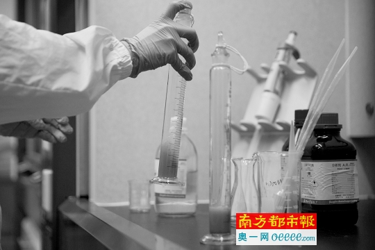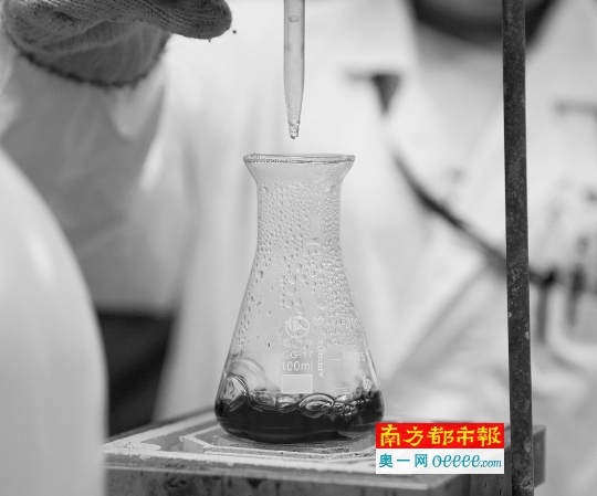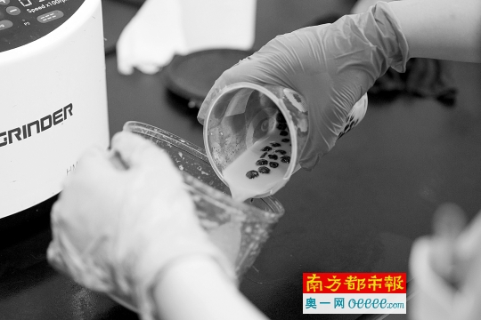 随后,20款奶茶共40杯被送到广东省食品检验所,进行咖啡因、总糖分、脂肪和反式脂肪酸的成分检验。负责本次检验的广东省食品检验所工程师介绍,要检测奶茶中的成分含量,必须进行样本前处理,首先把奶茶倒入研磨仪,使奶茶和珍珠搅碎、充分混合均匀,方便取样检测,结果也更加严谨科学。